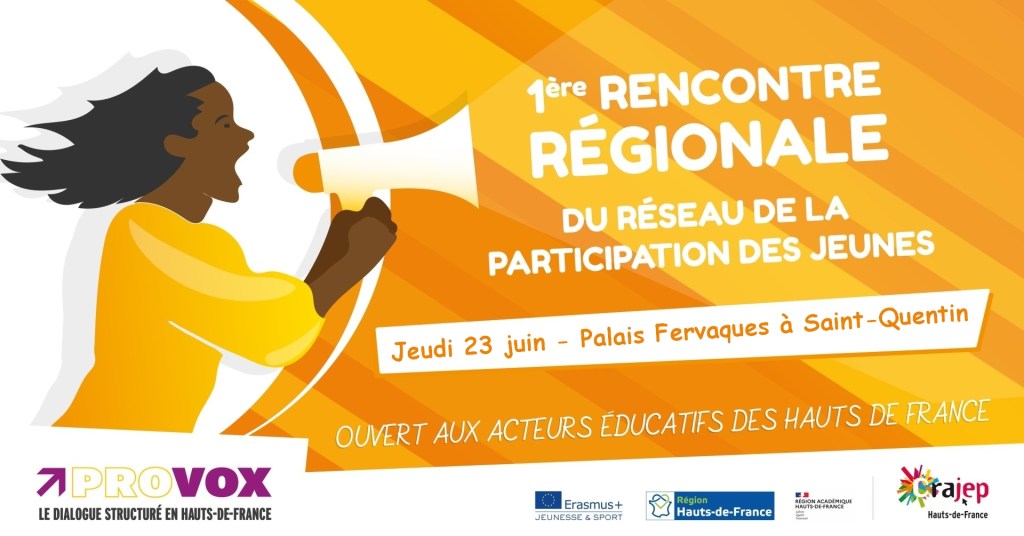 Le CRAJEP avec le concours de la ville de Saint-Quentin vous invite en tant qu’acteur éducatif à la 1ère rencontre régionale du réseau de la participation des jeunes le jeudi 23 juin au Palais de Fervaques à Saint-Quentin (Rue Victor Basch). Cette journée s’inscrit dans la démarche Provox Hauts-de-France qui porte et fédère la participation citoyenne des jeunes dans notre région. Ainsi, cette rencontre régionale se donne pour objectifs :