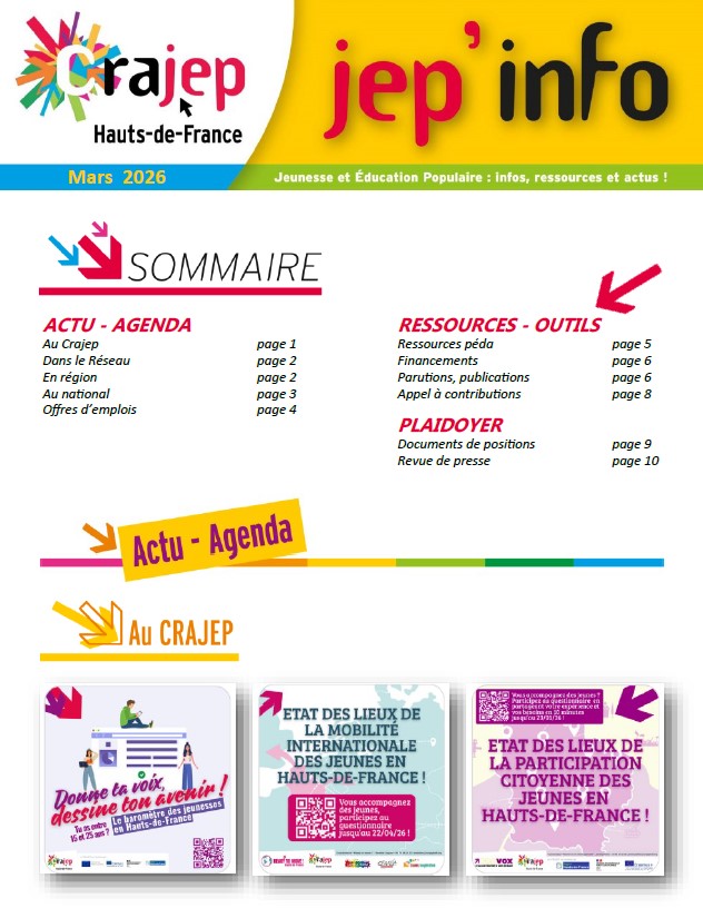 Chaque mois, le CRAJEP Hauts-de-France publie sa JEP’Info, une infolettre destinée aux acteurs et actrices de la jeunesse et de l’éducation populaire.