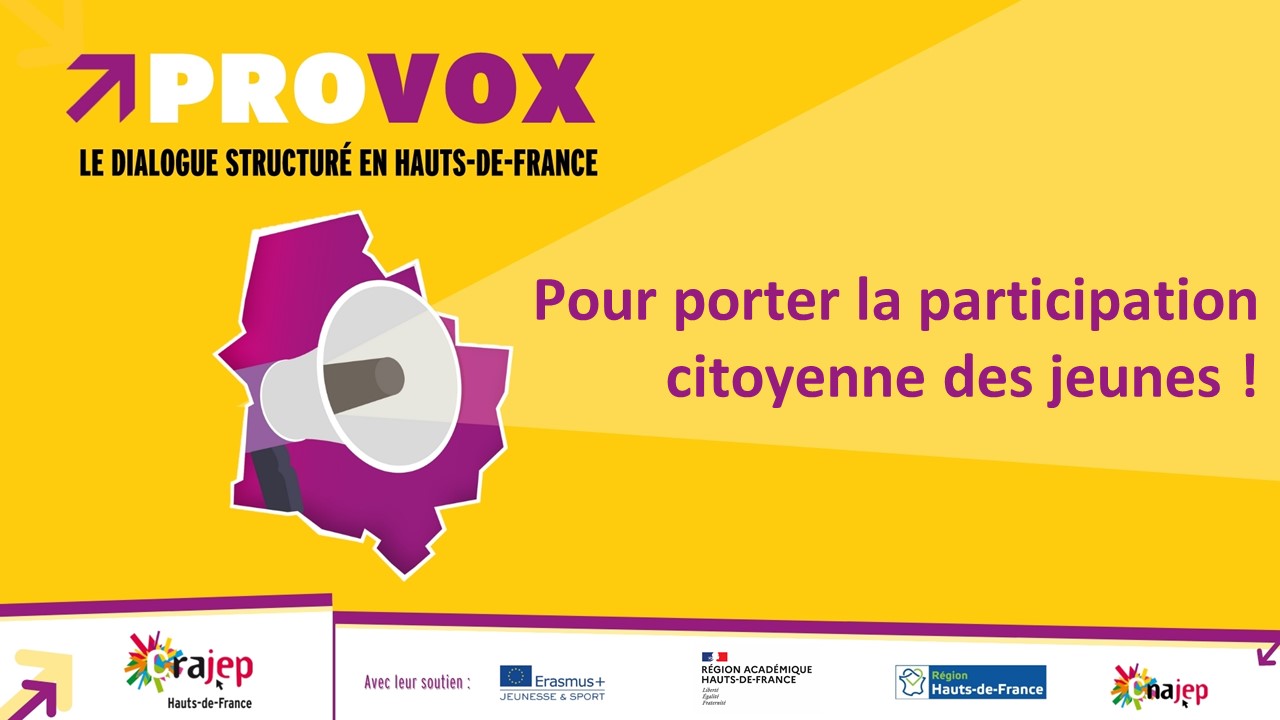 Provox Hauts de France est une démarche qui vise à porter la parole des jeunes, à favoriser la participation des jeunes et à co-construire des propositions pour améliorer l’efficacité des politiques publiques en lien avec la jeunesse.