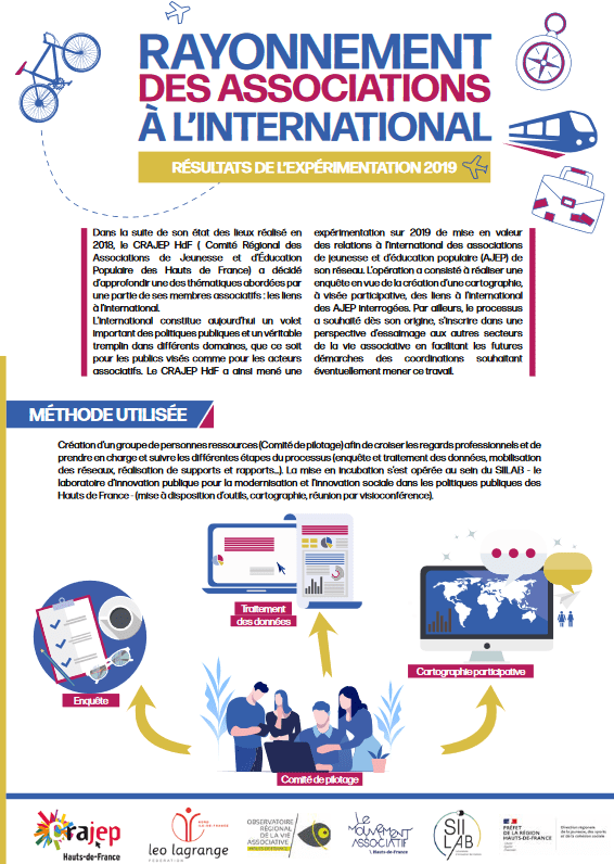 En 2019, le CRAJEP HdF a mené une expérimentation de mise en valeur des relations à l’international des associationsde jeunesse et d’éducation populaire (AJEP) de son réseau. L’opération a consisté à réaliser une enquête en vue de la création d’une cartographie. LE RAPPORT : https://crajephdf.org/wp-content/uploads/2021/07/rapport-rayo-ajep.pdf LA PLAQUETTE SYNTHETIQUE : https://crajephdf.org/wp-content/uploads/2021/07/plaquette-rayonmnt-international.pdf