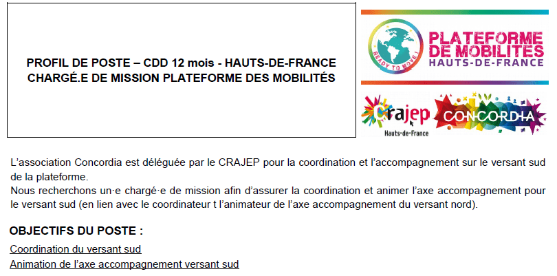 CONCORDIA recherche son/sa chargé.e de mission pour animer sur le versant sud HdF, la Plateforme de Mobilités READY TO MOVE portée par le CRAJEP HdF. Lire la suite