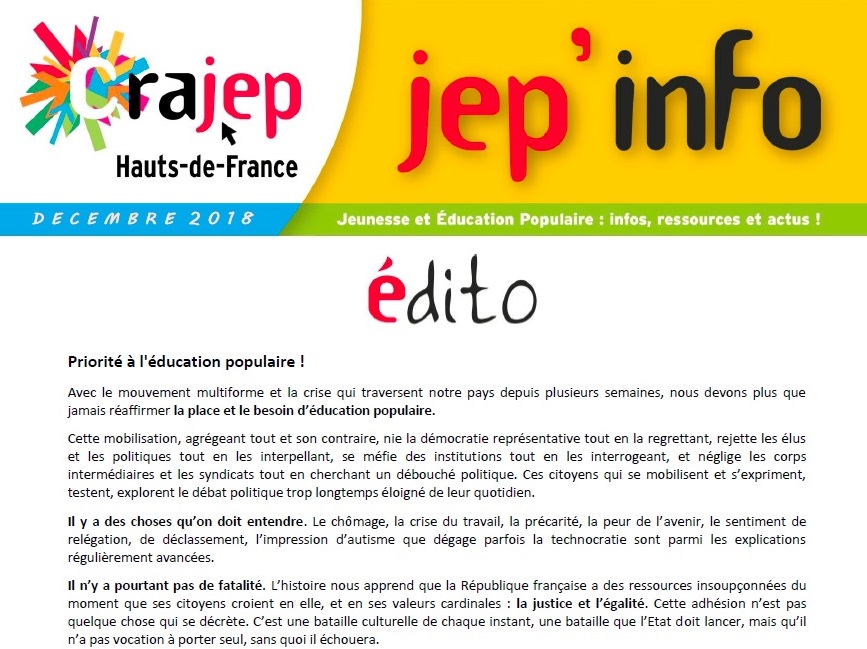 LA JEP’ INFO de JANVIER 2019 : infos, ressources et actus Jeunesse et Education Populaire ! Lire la suite