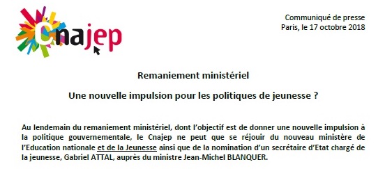 Remaniement ministériel : Une nouvelle impulsion pour les politiques de jeunesse ? Au lendemain du remaniement ministériel, dont l’objectif est de donner une nouvelle impulsion à la politique gouvernementale, le Cnajep ne peut que se réjouir du nouveau ministère de l’Education nationale et de la Jeunesse ainsi que de la nomination d’un secrétaire d’Etat chargé de… Lire la suite
