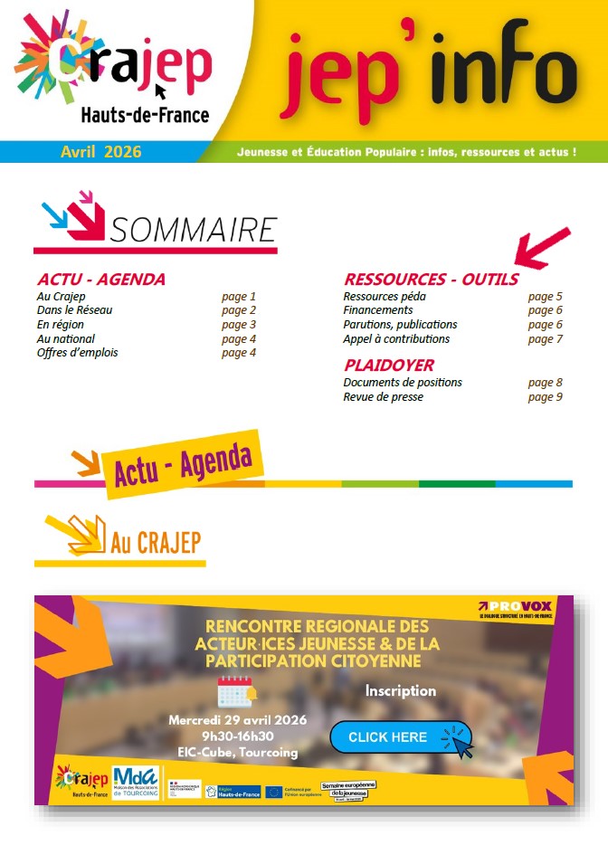 Chaque mois, le CRAJEP Hauts-de-France publie sa JEP’Info, une infolettre destinée aux acteurs et actrices de la jeunesse et de l’éducation populaire, en faveur de la participation, de l’engagement des jeunes et de l’éducation populaire, qui met en lumière événements régionaux et nationaux, appels à projets et financements, prises de position et documents de plaidoyer, et une sélection de ressources et articles pour nourrir la réflexion et l’action.