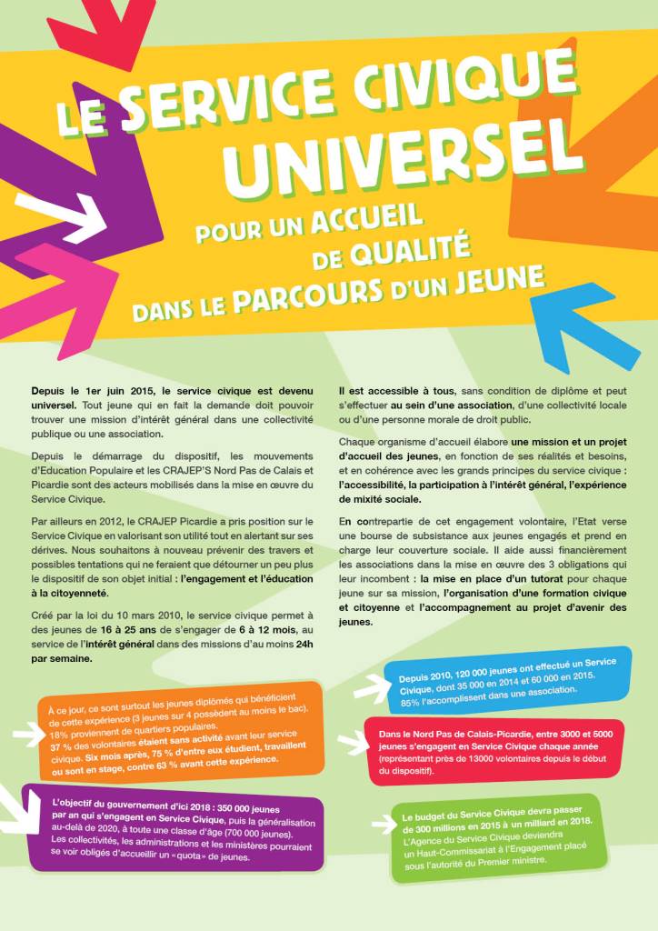 En 2015, le Service Civique devient universel et l’Etat affiche sa volonté de décupler le nombre de jeunes en mission. Le CRAJEP s’est alors mobilisé pour défendre en 1er lieu, un accueil de qualité à travers une plaquette à la fois politique et pédagogique.