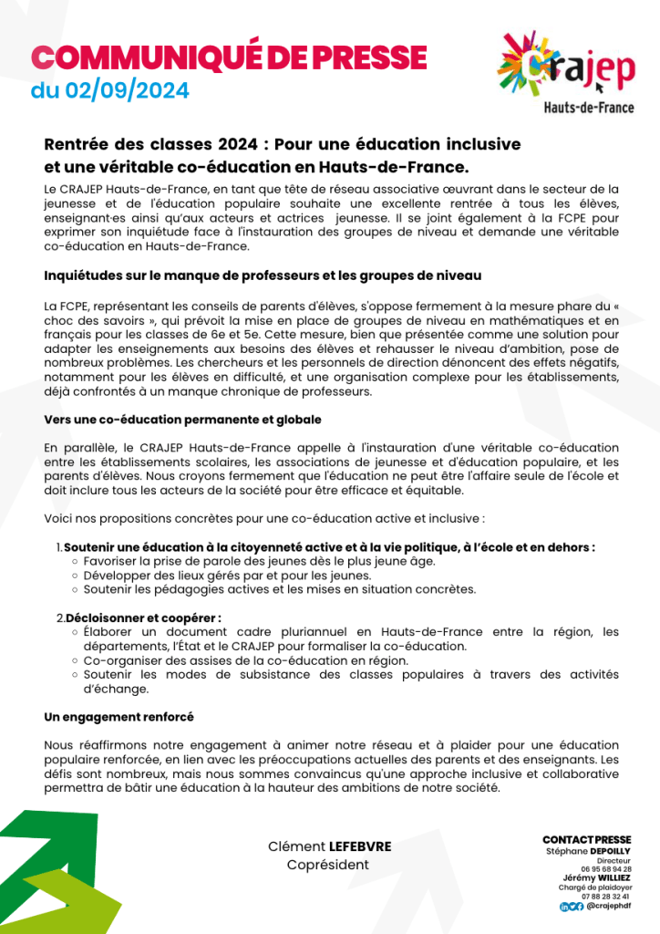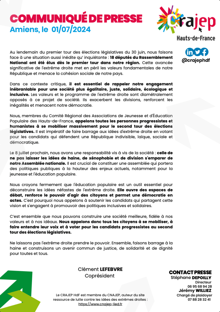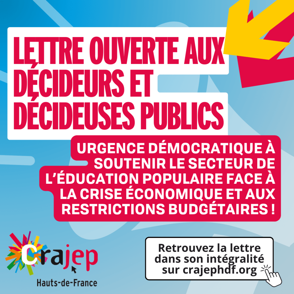 Le 10 octobre 2025, le CRAJEP Hauts-de-France adresse un courrier d’interpellation aux élu·es du territoire pour alerter sur la situation alarmante des associations de jeunesse et d’éducation populaire.Partout dans la région, ces structures jouent un rôle essentiel : elles font vivre le lien social, la citoyenneté, la culture, la solidarité et l’émancipation. Elles accompagnent les… Lire la Suite